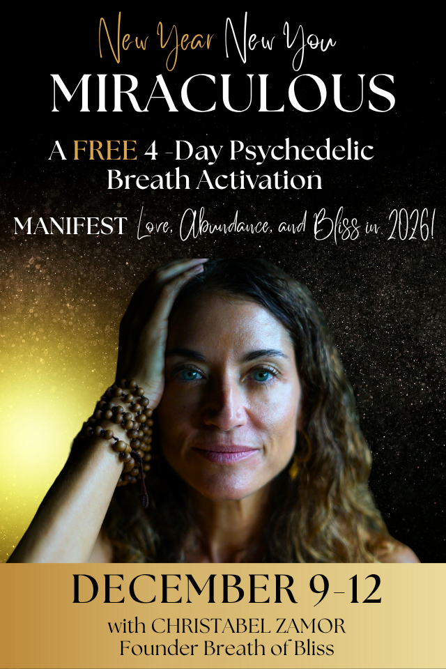 Enjoy a direct experience of quantum expanded states to prepare for Saturday with this 8-minute clip from a Breath of Bliss Ceremony. Put on headphones for better sound. Lie down. Close your eyes. Connect the inhale and exhale without pauses through an open mouth. Move your body, breathe, express with this somatic activation… see what happens! Give yourself time to integrate afterwards. Hydrate and journal — we would love to hear your share what you experienced when we meet!